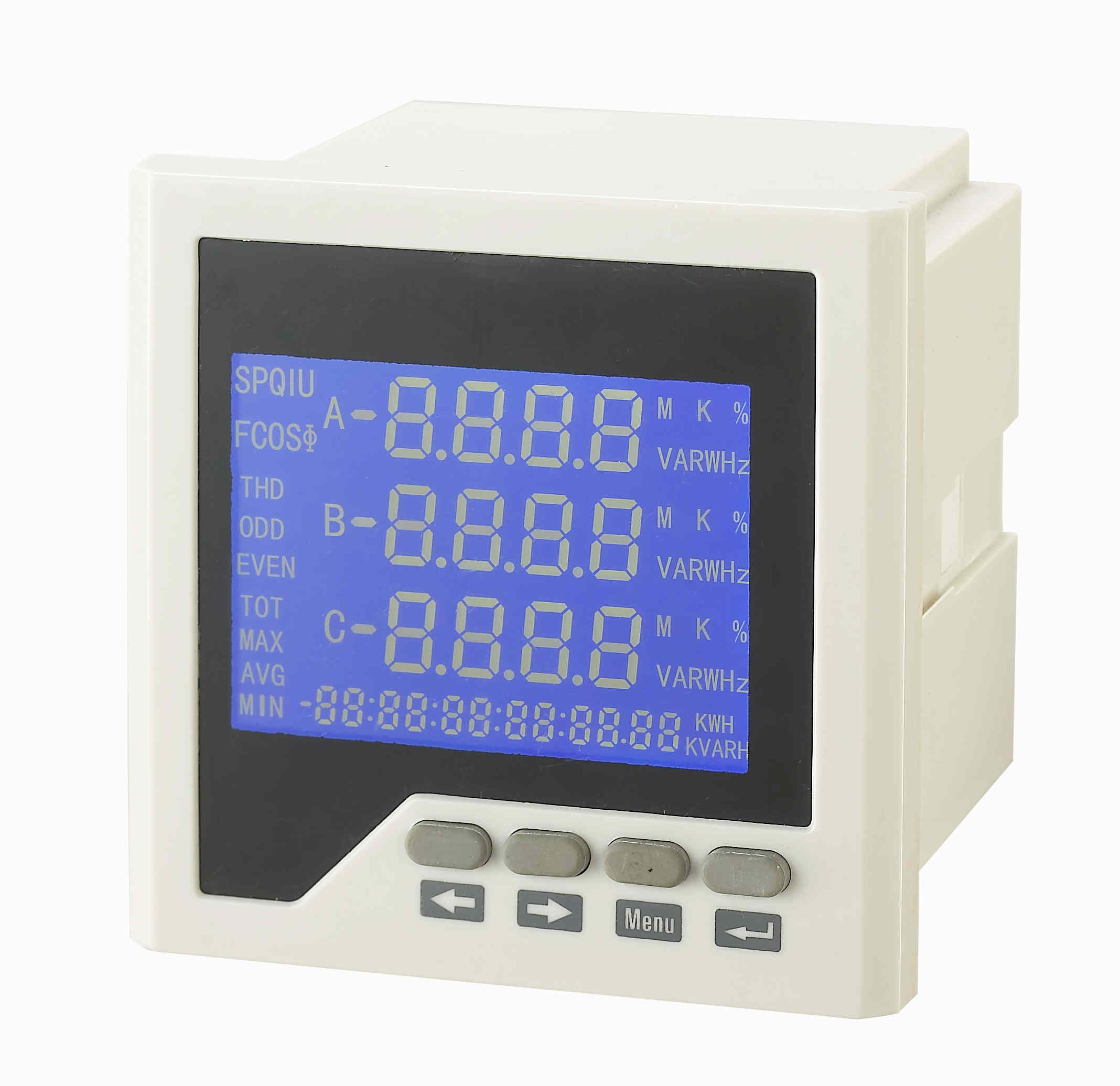 電力儀表,一種具有可編程測(cè)量、顯示、RS485數(shù)字通訊和電能脈沖輸出的多功能智能電力儀表,能夠完成三相電參量測(cè)量(三相電壓、三相電流、有功功率、無(wú)功功率、視在功率、功率因數(shù)、頻率等)、諧波測(cè)量、電網(wǎng)質(zhì)量分析(電壓波峰系數(shù),電流K系數(shù),電話波形因子,電壓電流不平衡度,電壓電流序量等)、四象限電能計(jì)量、復(fù)費(fèi)率電能計(jì)量、最大需量記錄、SOE事件記錄、數(shù)據(jù)顯示、采集及傳輸,可廣泛應(yīng)用變電站自動(dòng)化、配電自動(dòng)化、智能建筑、企業(yè)內(nèi)部的電能測(cè)量、管理、考核。測(cè)量精度0.5級(jí),實(shí)現(xiàn)LCD現(xiàn)場(chǎng)顯示和遠(yuǎn)程RS-485數(shù)字接口通訊,采用標(biāo)準(zhǔn)MODBUS-RTU通訊協(xié)議。